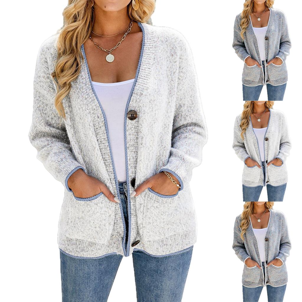 Damenmode Lässig Kontrastfarbe V-Ausschnitt Langarm Knopf Stricktaschenpullover Strickjacke Jacke