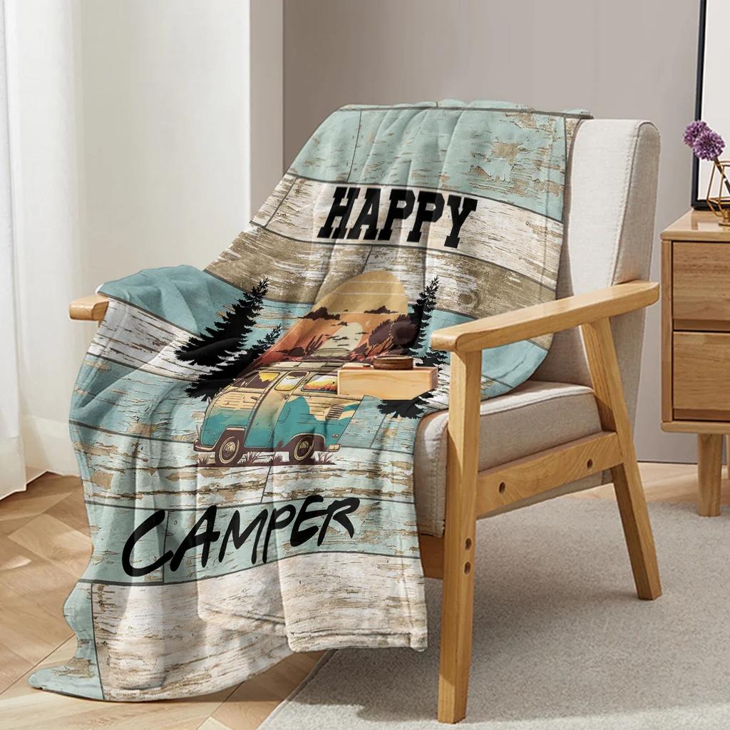 Holzmaserung glücklich Camping Bus Muster Tagesdecke weiche gemütliche Fleece Flanelldecke für Couch Schlafsofa