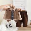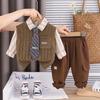 Kleiden Sie Ihren jungen Gentleman stilvoll mit diesem charmanten dreiteiligen Pulloverwesten-Set, perfekt für Frühling und Herbst.. Das Set hat ein langärmeliges Design und ist aus weicher, atmungsaktiver Baumwolle gefertigt für ganztägigen Komfort.. Es vereint klassische Eleganz mit einem trendigen koreanischen Flair und macht es zu einer vielseitigen Wahl für jeden Anlass.. Ob es sich um ein Familientreffen oder einen Ausflug handelt, dieses Outfit sorgt dafür, dass Ihr Kleiner gut aussieht und sich wohlfühlt.