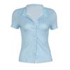Sweetown Blaustreifen Kurzarmhemden für Damen zum Knöpfen Umlegekragen Slim Schlicht Lässig Preppy Oberteile Basic Sommer T-Shirts