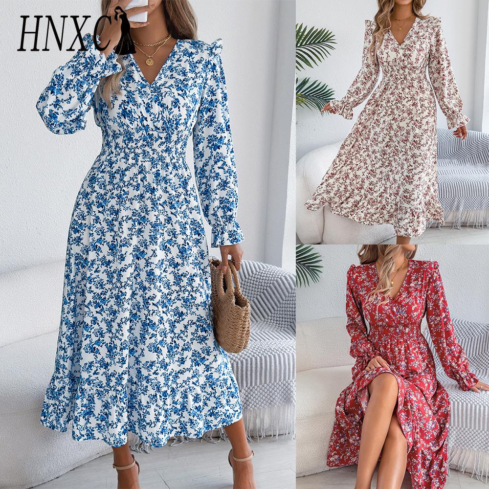 HNXC Autumn and Winter Elegant Floral Cross V-neck Cinched Waist Ruffled Long Dress Women's Wear