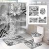 4Pcs Gray Romantic Heart Pattern Shower Curtain Set, Bathroom Curtains, Bathroom Decorative Shower Curtains, Bathroom Floor Mat