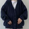 Modische marineblaue Strickjacke mit rautenförmigem Karomuster, lockerer V-Ausschnitt, mittellang, College-Stil, Sweaterjacke 6356#