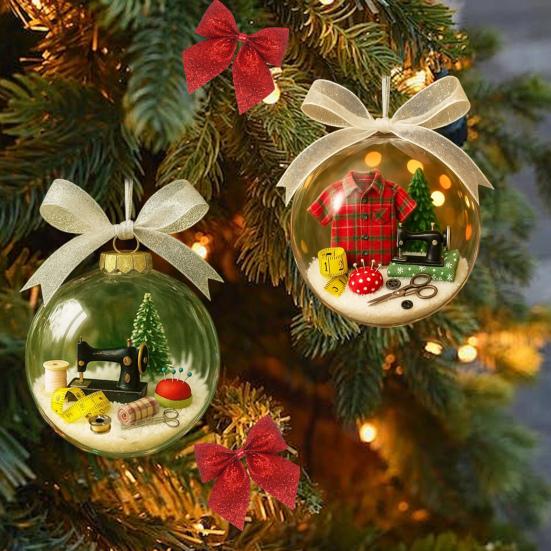 Verleihen Sie Ihrem Weihnachtsbaum einen Hauch von Eleganz und Charme mit unserer exquisiten Weihnachtskugeldekoration. Handgefertigt mit Liebe zum Detail, jede Ornament verfügt über ein einzigartiges Miniatur-Näh-Thema und zeigt Vintage-Nähmaschinenstoffe und Bänder, die in klarem Glas eingeschlossen sind.. Diese besondere Dekoration ist perfekt für Nähbegeisterte, die ihrer Weihnachtsdekoration eine persönliche Note verleihen möchten.