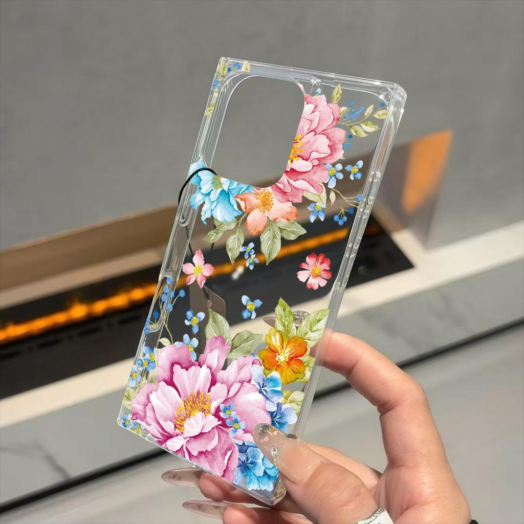 Transparente Quadratische Rückseite Röhrenhülle Schutz Für iPhone 11 16 ProMax 12 14 Pro Max 15 Plus 13 Anti-Sauerstoff, Musterhülle mit üppiger Blüte