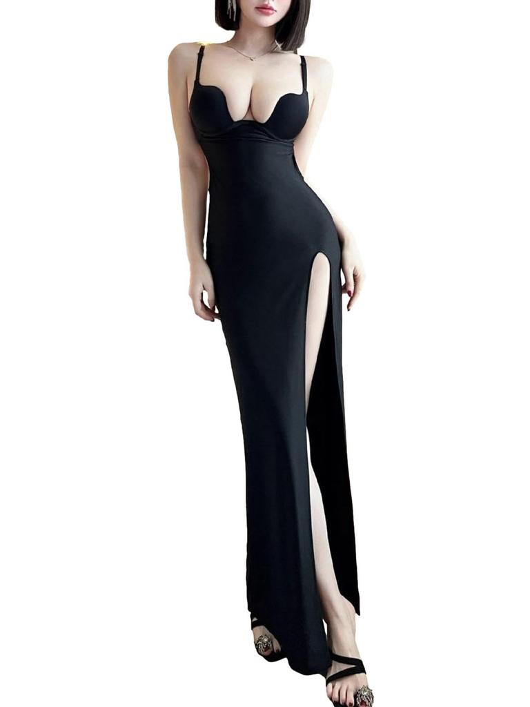 ISLAYCAOLILA EM9 Niella Party Women's Dress, Long, Evening, Dress, Flared, Long, Slit, Camisole, Sleeveless, Waist-Lined, (L, Black)