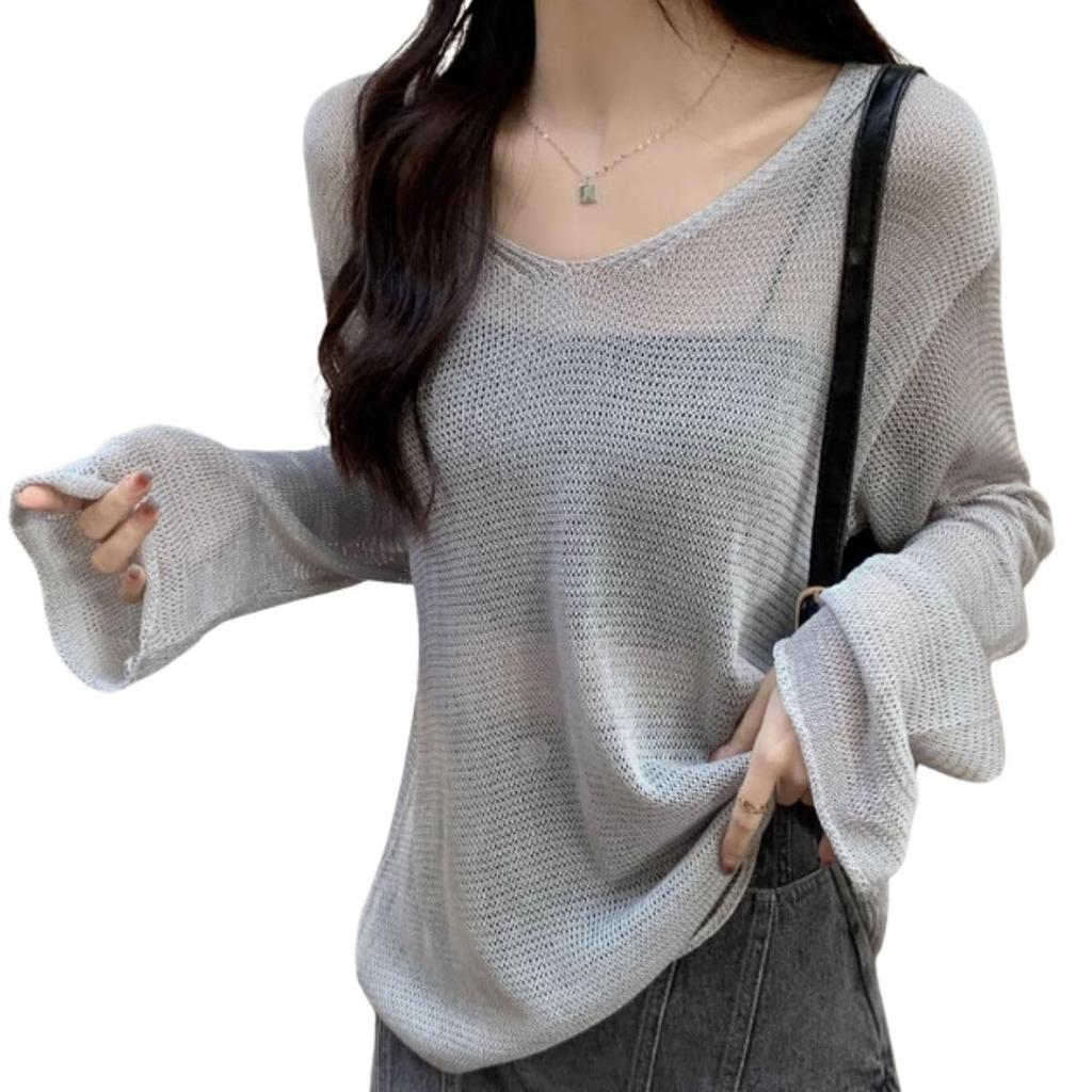 Belle Cie Openwork Knit Loose Long Sheer Women's Top, Fit, Sheer, Sleeves, (ST/No. 22009) (Gray)