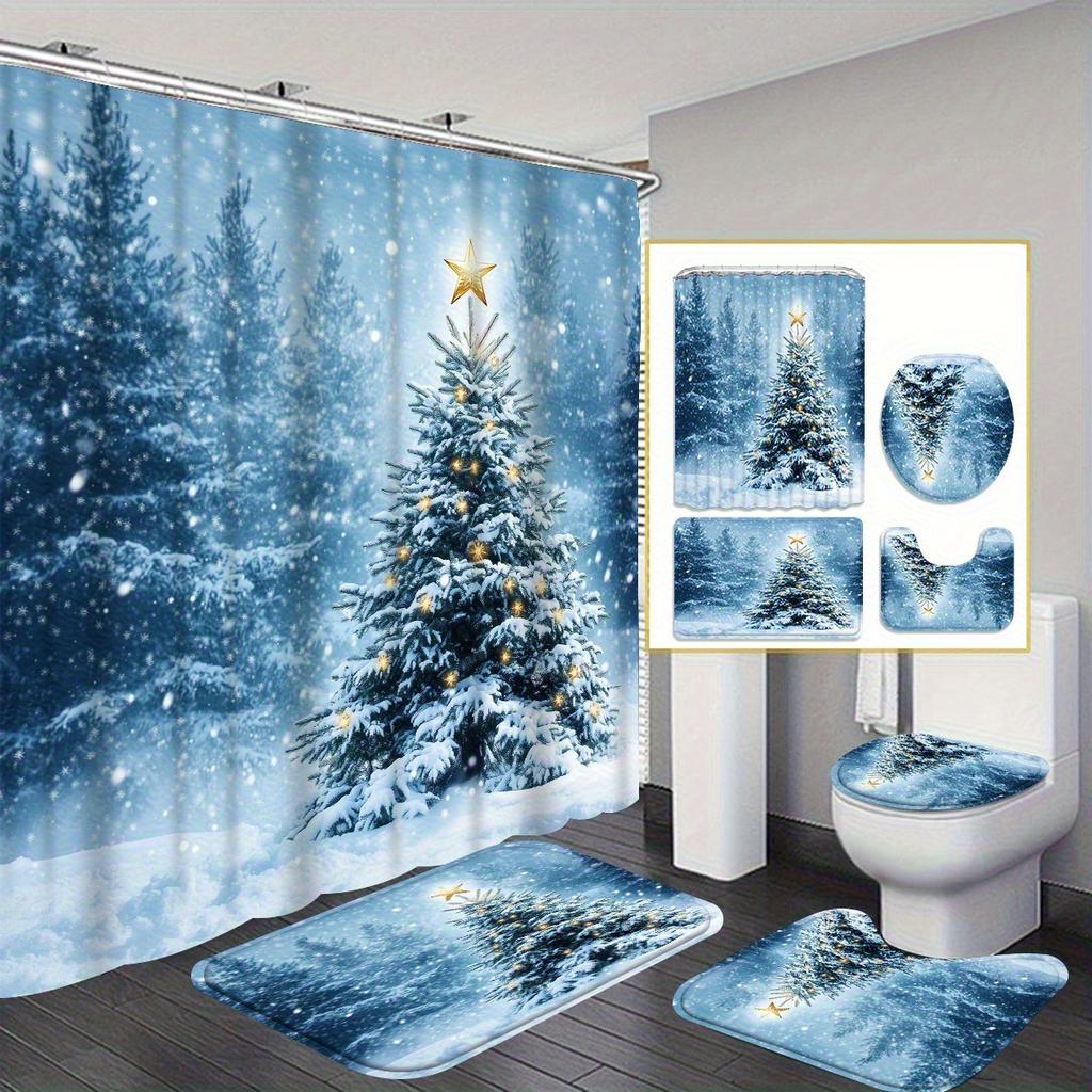 4-teiliges Badezimmer-Duschvorhang-Set Weihnachtsszene Wintermuster Badezimmervorhang mit 12 Haken Rutschfeste Teppiche Toilettendeckelmatte Badezimmerabtrennung