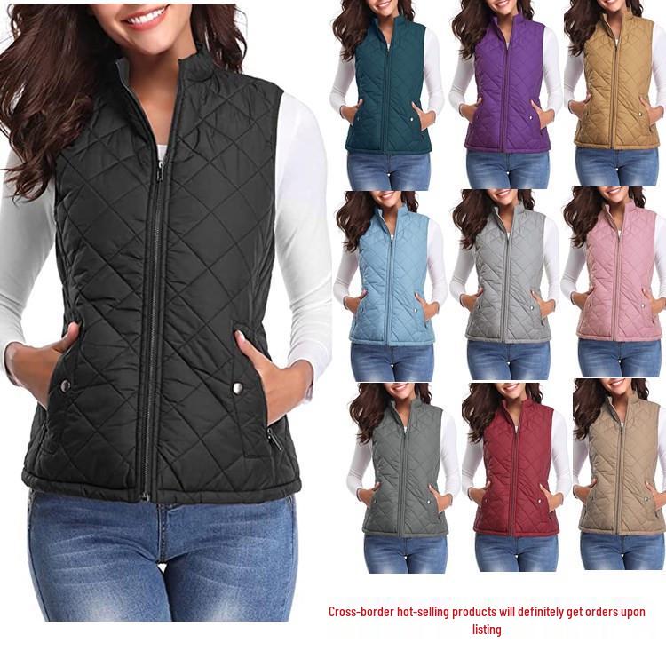 2022 Damenmode Gesteppte Baumwollweste mit Reißverschlusstaschen und Stehkragen