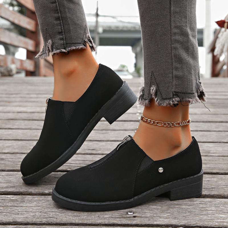 Retro kleine Lederschuhe Damen Herbst und Winter neu runde Spitze dicker Absatz Reißverschluss vorne Faulpelz Frau