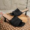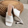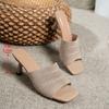 Sommer neue fliegengewebte Hausschuhe Damen Außen tragen eckiger Kopf Ein-Wort-Schlepp dicker Absatz Mode hochhackig coole Hausschuhe Damen
