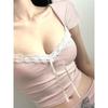 H's European and American Women's Clothing Retro Sweet Plant Florals Print Pink T-shirt Drawstring Lace Low-Cut Short Top
