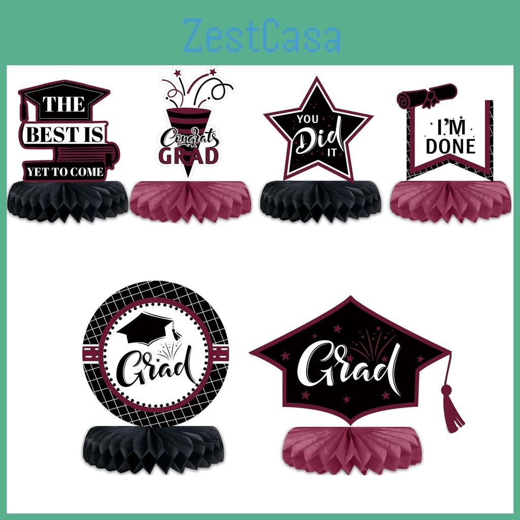 This graduation-themed honeycomb decoration set includes six paper-based ornaments in various colors such as gold, red, burgundy, blue, purple, and green. Designed for desktop display, offering a lightweight and vibrant. Ideal for decorating graduation parties and celebratory events, these props enhance festive atmospheres. Easy to assemble and maintain, simply wipe with a damp cloth to clean and reuse for future occasions.