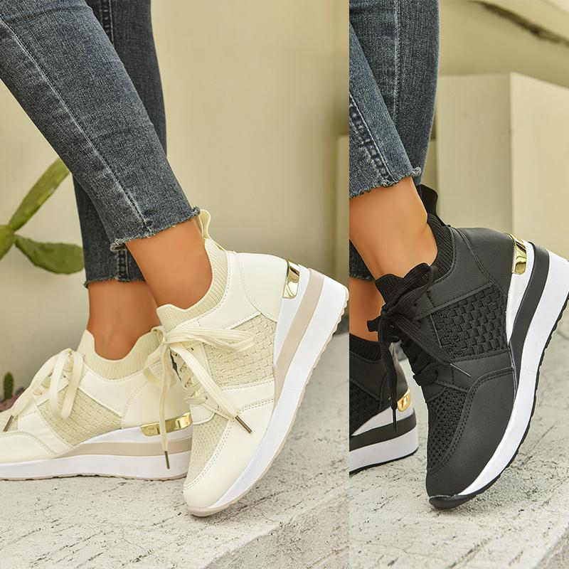 Mode Luxus Gestrickte Mesh Keilabsatz Sneaker Frau Markendesign Metall Hoher Absatz Netz City Laufschuhe Damen Atmungsaktiv Lässig Zapatos