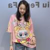 Übergröße Kurzarm T-Shirts Damen Sommerkleidung Bestickt Schlagärmel Cartoon Bedruckt Diamanten Lässig Locker O-Ausschnitt Strickware