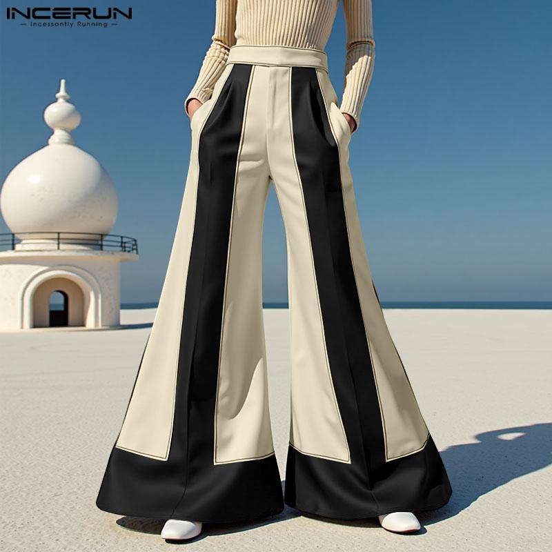 INCERUN Men's High Elastic Waist Striped Patchwork Casual Long Flare Pants Trousers