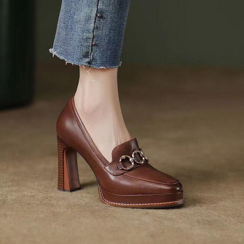 Fashion FHANCHU 2025 Rindsleder Schuhe,Damen Plateau High Heels,Viereckige Zehenpartie, Slipper,Retro-Stil,Braun,Schwarz,Größe 34-39,Dropship