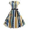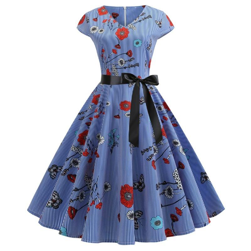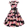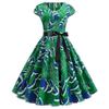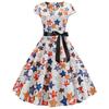Vintage supply V-neck cover sleeve full body print big swing skirt with black ribbon