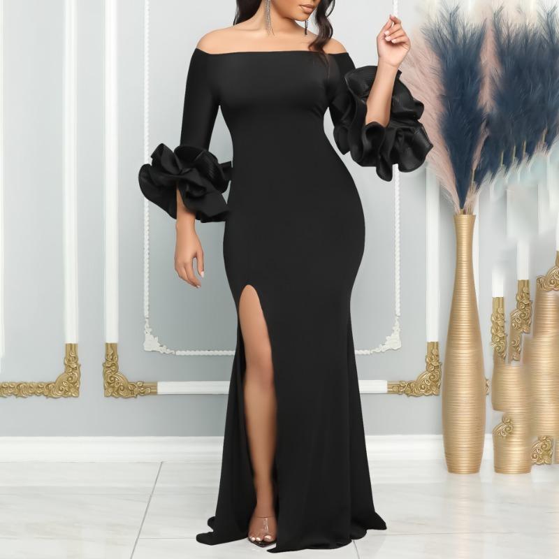 Women's temperament one-word collar sexy split lotus leaf sleeve long dress banquet party evening dress