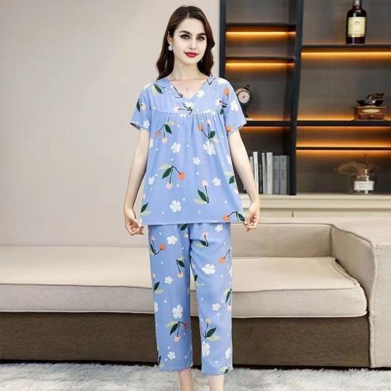 Damen-Schlafanzug-Set aus Baumwolle, kurzärmliges Oberteil und lange Hose, lässiges zweiteiliges Nachtwäsche-Set für den Sommer, Übergröße, dünne Loungewear für ältere Mütter