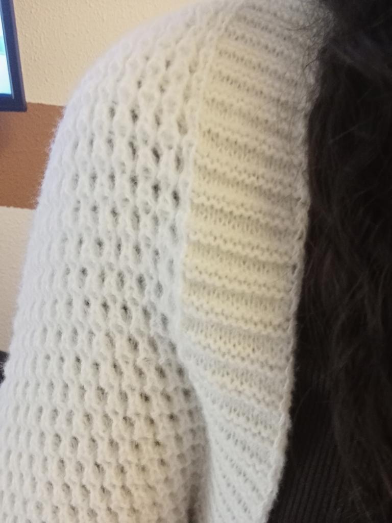 Cardigan - französischer entspannter Stil. Dieser Cardigan zeichnet sich durch einen lockeren Schnitt und Fledermausärmel aus. Er ist aus leicht elastischem Strick mit Rippstrickstruktur gefertigt. Ein asymmetrischer Saum und ein Schalkragen vervollständigen das Design.