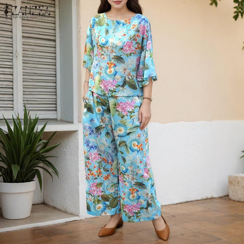 ZANZEA Women 3/4 Sleeve Blouse and Pants Casual Floral Print Two Piece Suit Sets