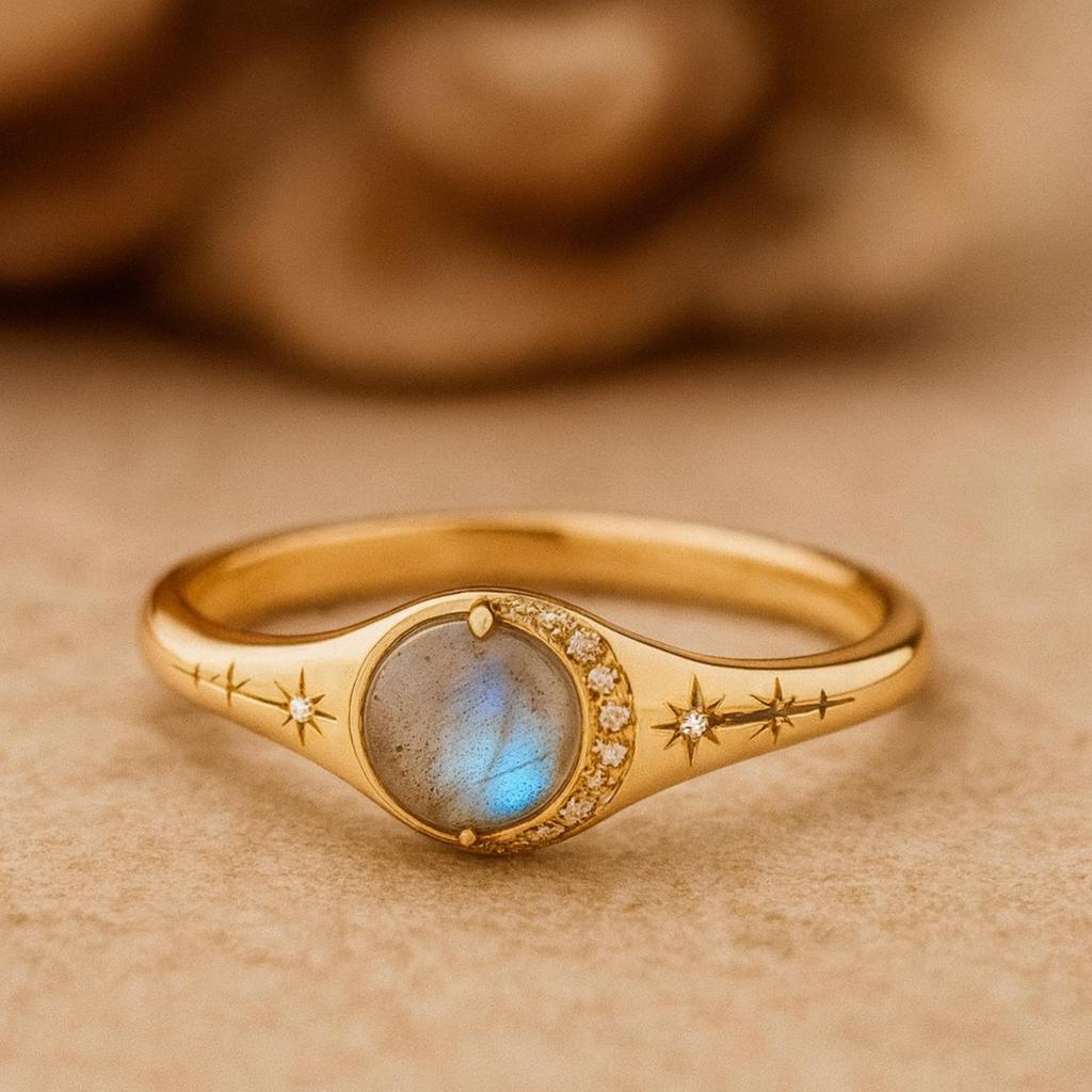 Fangen Sie die Magie des Nachthimmels mit diesem Himmlischen Labradorit-Ring ein, einer perfekten Mischung aus Mystik und Eleganz. Der runde Labradorit-Edelstein leuchtet mit natürlichen blauen und grauen Reflexen, während schimmernde Zirkonia-Steine einen zarten Halbmond um ihn herum bilden.