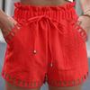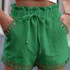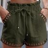 Shorts aus Baumwollleinen für Damen, einfarbig, dünn, mit ausgehöhltem Design, mit Taschenbesatz, enge Taille, Shorts für den Strand, Weiß