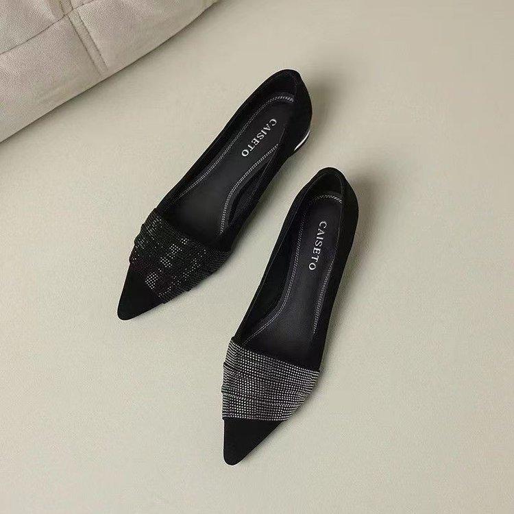 Herbst vielseitig matt spitz zulaufend Mode Temperament schwarz Arbeitsschuhe Strass niedriger Absatz Strass flacher Ausschnitt Einzelne Schuhe Damen