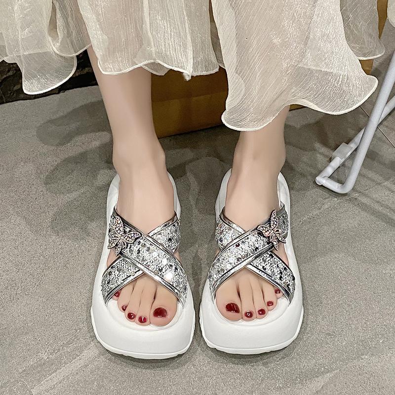 Mode 8CM Damen Klobige Hausschuhe Sommer Hohe Plateau Keile Blingbling Schuhe Frau Strand Flip Flops Dicke Sohle Sandalias Mujer