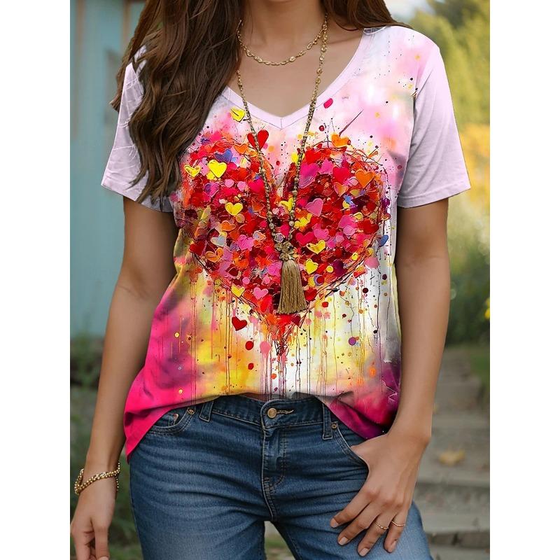 Sommer V-Ausschnitt 3D Liebesmuster Bedrucktes Top Modische Lässige Kurzarm Damen T-Shirts