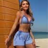 Gestreifter Druck Shorts Bikinis Set 3-teiliger Sexy Badeanzug Damen Urlaubsbademode String Neckholder Dreieck Bikini Strandbekleidung
