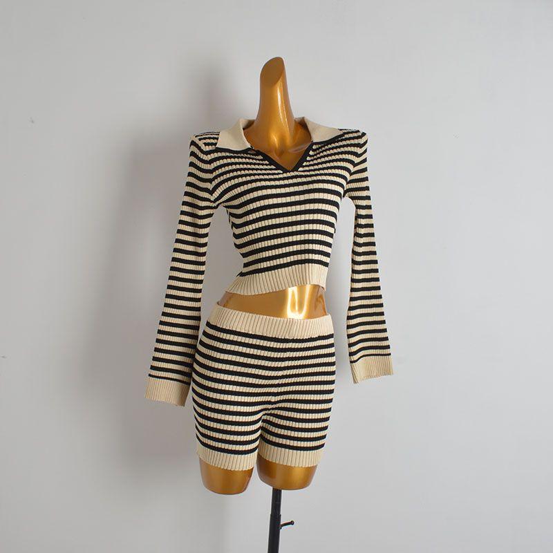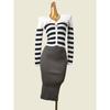 Set Color Matching Stripe Lapel Pullover Knit Skirt Women clothes Slim fit Slimming Sheath Two piece skirt