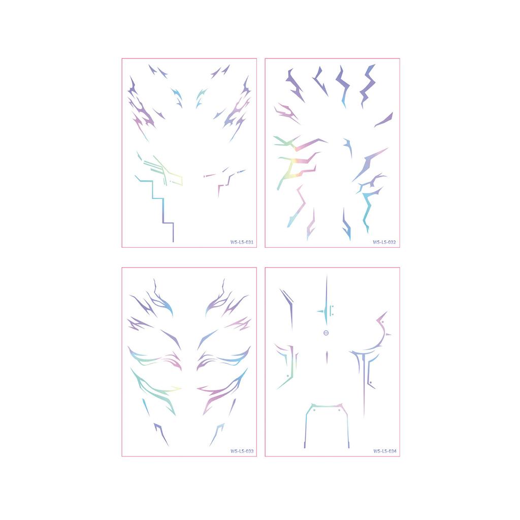 Bei Anwendung auf der Haut verursacht es nicht leicht Reizungen und hat eine mäßige Haftung.. Es lässt sich bei normalen Aktivitäten nicht leicht abziehen.. Beim Abschminken kann es leicht mit warmem Wasser abgewischt werden, ohne dass zusätzliche Make-up-Entfernungsprodukte erforderlich sind.. Das Aufklebermuster hat klare, deckende Anime-Charakterelemente, geometrische Lichteffekte und andere Designs.. Es kann je nach Bedarf zugeschnitten und auf Gesicht, Arme und andere Körperteile geklebt werden, um personalisierte Anpassungsbedürfnisse zu erfüllen.. In der Tat
