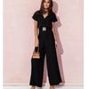 Fashion Spring/Summer New V-neck Fashion Temperament Pure Color Minimalist Loose Wide Leg Short Sleeve One-Piece Pants Jumpsuit