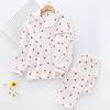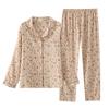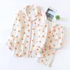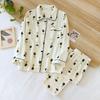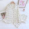 Damen Pyjama Set für den Frühling, mit Herzmuster, aus Krepp-Baumwolle, doppellagiger Gaze, Umlegekragen, langärmelig, mit Hose, Hausbekleidung