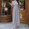 Plus Size Women's Clothing Fat Sister K-style Summer round Neck Stripes Waist-Controlled Lace-up Mid Length Long Length Short Sleeve Dress L-4XL
