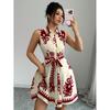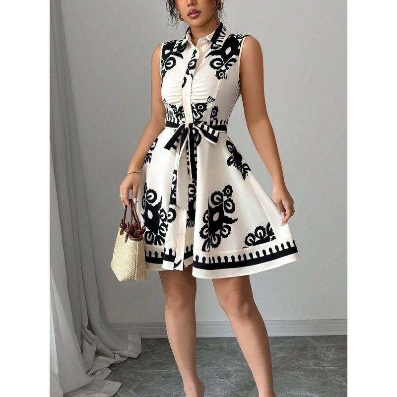 Cross-Border Western Style Summer New Lapel Single-Breasted Strap Waist Hugging Print Sleeveless Vest Dress Dress