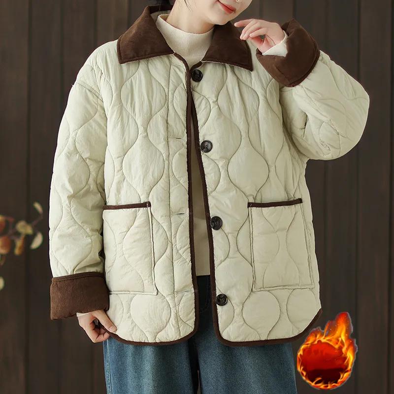 Damen Herbst- und Winter-Freizeitmantel mit Revers, verdickt und warm, leichte diamantgesteppte Colorblock-Jacke