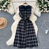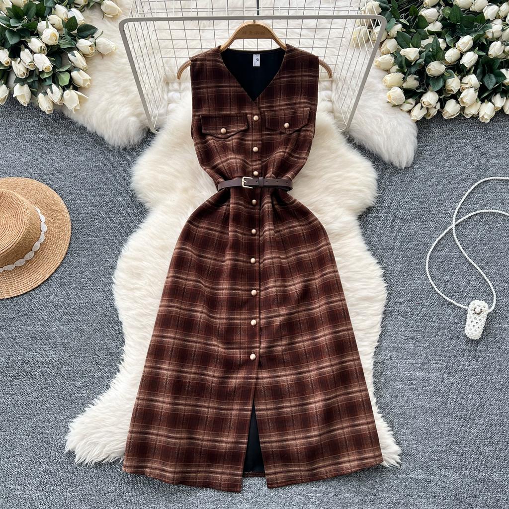 Herbst Winter Damen Vintage V-Ausschnitt Kariert Einreihig Lang Midi Tweed Tank Kleider mit Gürtel