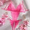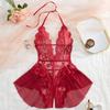 New Sexy Crotchless Pink Lingerie Women Set Lace Patchwork Hollow Bodysuit Erotic Pajamas Teddy Babydoll Dress Deep V Open Bra