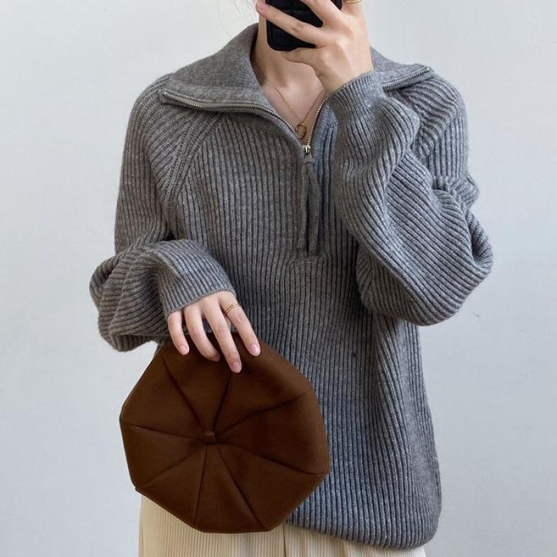 Autumn and winter new gentle solid color half-open lapel pit strip design sense small short knitted pullover sweater women