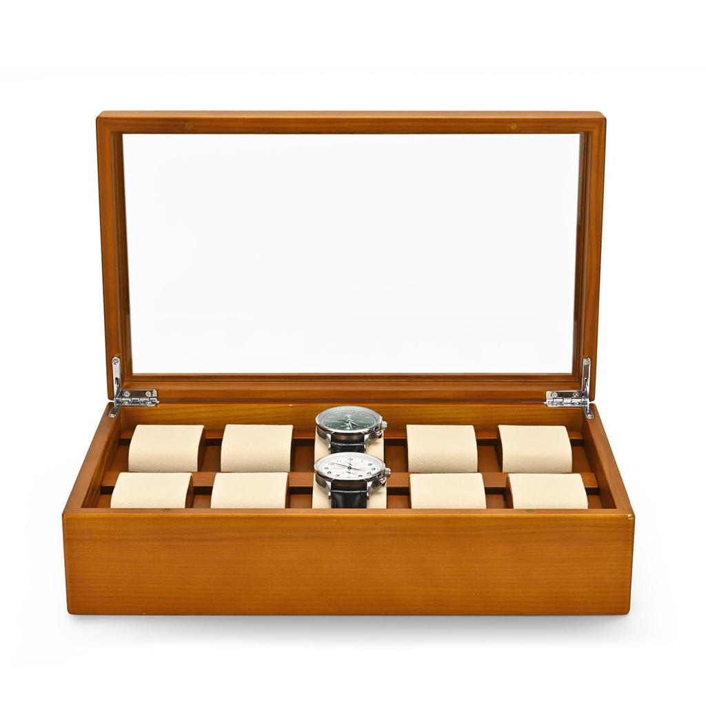 Woodten Massivholz-Uhrenbox mit Glas Premium-Uhren-Display-Organizer mit herausnehmbarem Kissen für Herren 10-Schlitz-Deckel, (Cremeweiß)