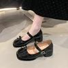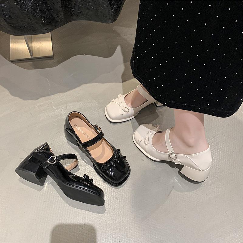 Französische Mary Jane Schuhe Damen 2025 neu Frühling Lackleder eckige Spitze Schleife kleine Lederschuhe leichter Ausschnitt dicker hoher Absatz einzelne Schuhe