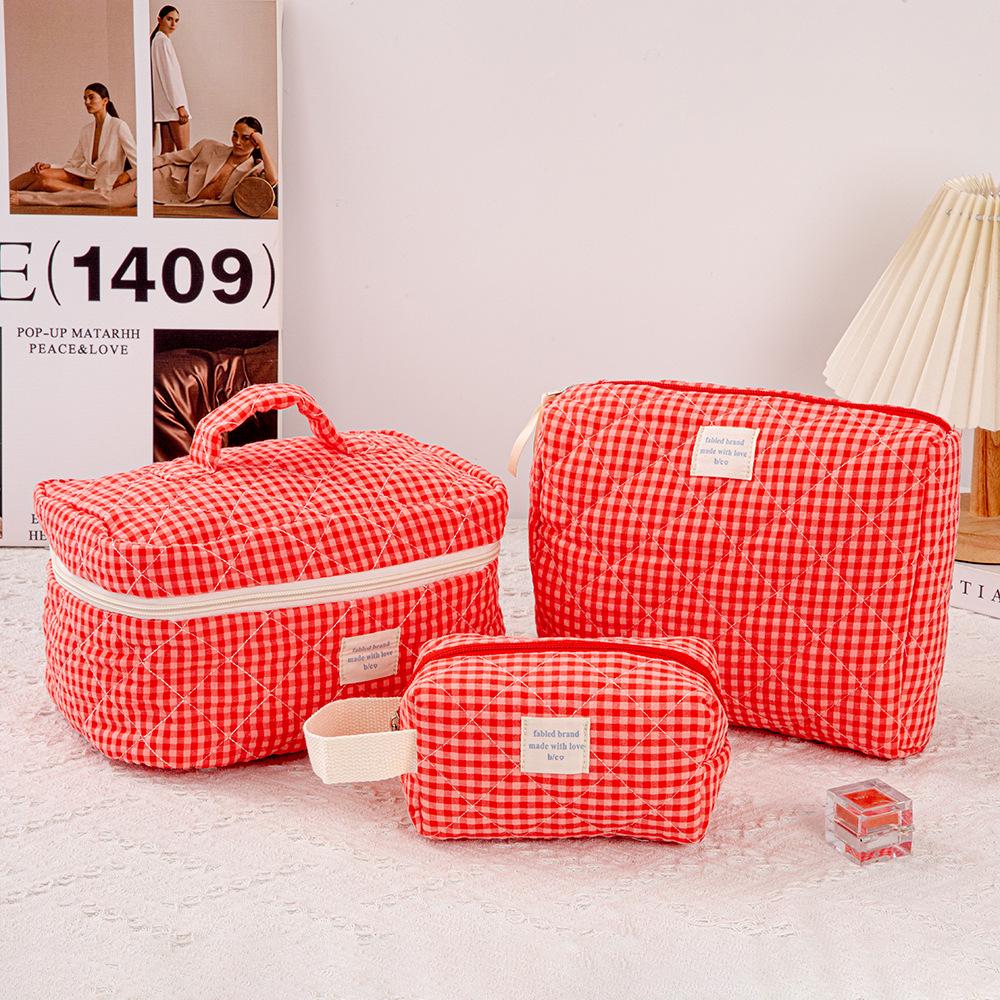 Gestepptes Rot Kariertes 3-teiliges Make-up-Taschen-Set mit Clutch mit großem Fassungsvermögen