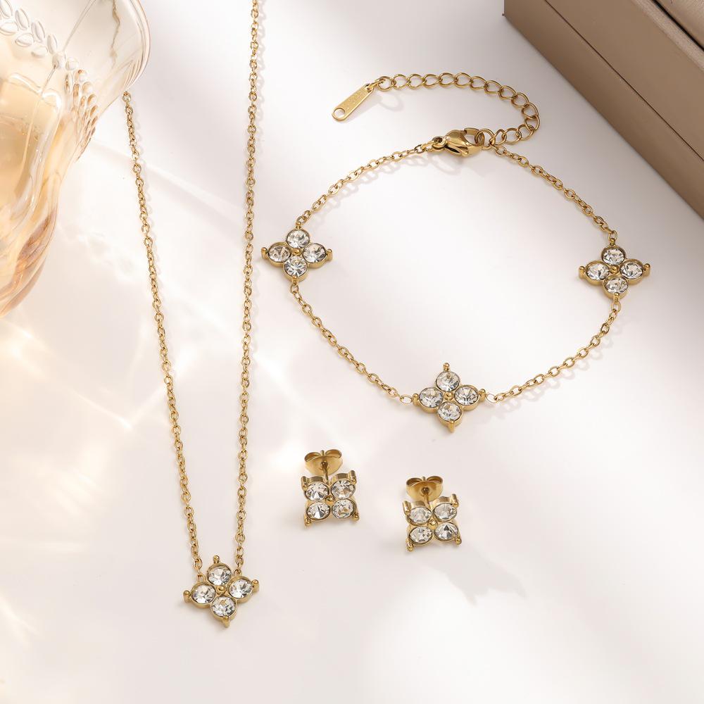 Elegantes Zirkon Kleeblatt Schmuckset: Armband, Halskette und Ohrstecker für Damen