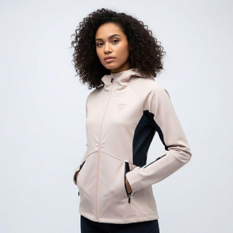 Puderrosa Softshelljacke tailliert mit Kapuze und schwarzen Reißverschlusstaschen Damen ROSSIGNOL