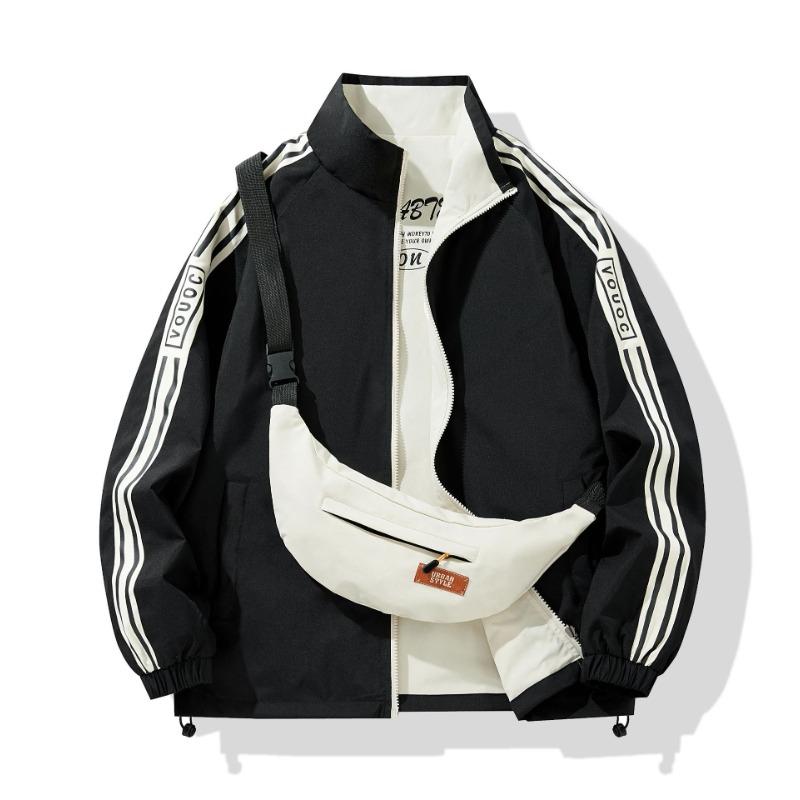 Jacken für Herren Frühling und Herbst Neu Doppelseitige Stehkragenjacke Gestreiftes Gurtbanddesign Kleidung für Herren