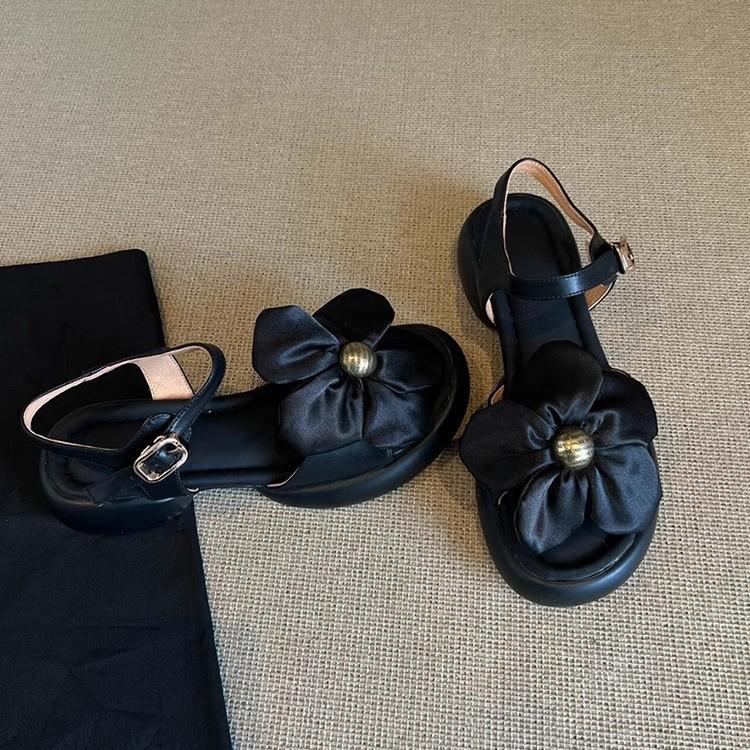 Weiche Lederversion! Sommer mit Rock, Sandalen, Metallblumen, schwarzer runder Spitze, Ein-Wort-Schnallenriemen, dicker Absatz Römerschuhe.