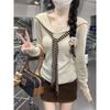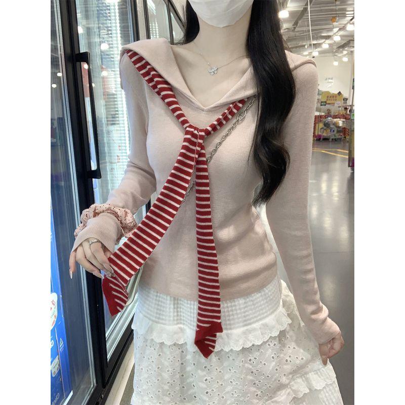 Kumikumi Sweet Style Contrast Color Striped Fake Two Pieces Long Sleeves Knitwear Female Autumn Slimming Easiest for Match Chic Tops